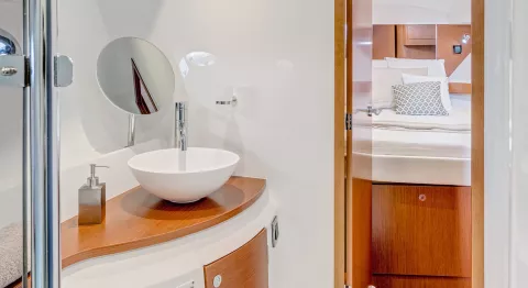 Der Bootsführersitz auf der Flybridge ist höhenverstellbar, am Steuerstand sind Halterungen für Navigationsinstrumente und das Armaturenbrett mit Anzeigen für Motoren, die elektrische Motorsteuerung, die Ankerspillsteuerung, die Schraube und die Flaps (optional). Vier Personen können bequem um den Tisch aus Massivholz Platz nehmen. Das große Sonnendeck verwandelt die Flybridge in einen Ort der Entspannung. Ein Eisschrank (30 L) ist optional.