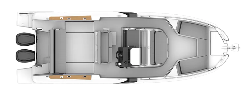 Der innovative Salon im Vorschiff mit Loungecharakter hat zwei Chaiselongues mit integrierten Stauräumen und lässt sich in eine Sonnenliege umwandeln. Das Heck kann entweder als Sonnenliege oder als Angelstand eingerichtet werden.