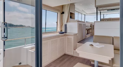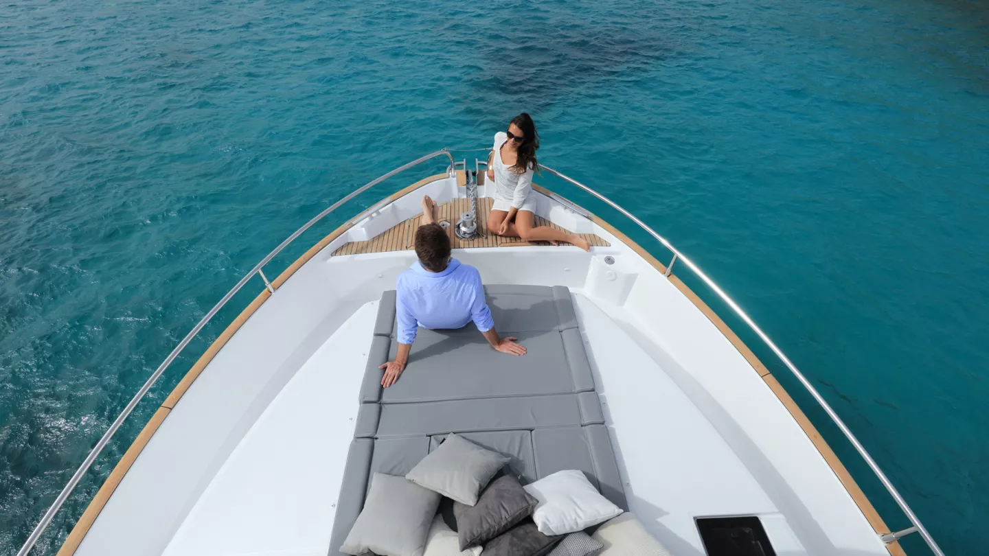 Joystick-Steuerung, elektrischer Ankerspill für ein einfaches Ankern, integrierte Kontrollkameras oder hydraulische Plattform für das zu Wasser lassen des Dingi: Die hochwertige Ausrüstung garantiert sicheres Fahren und Manövrieren. Clever ist auch die Dinette neben dem Steuerstand: Sie kann in eine Schlafgelegenheit für 4 Personen umgewandelt werden. Die Durchreiche zwischen der Küche und der Flybridge erleichtert das Leben auf dem Oberdeck.
