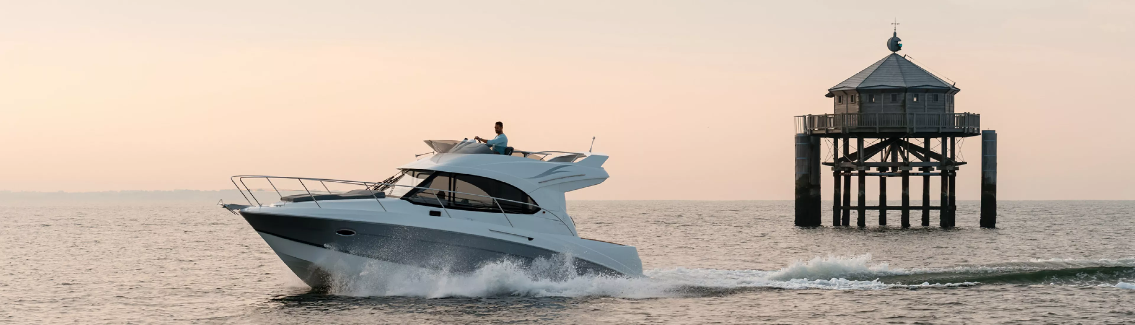 The Antares 30’s distinctive style is by Sarrazin Design. She has a classic look with taut lines and windows tinted grey. Her flybridge is particularly spacious, with a saloon, sunbathing area and a two driving stations on option. The grey-coloured hull of the latest “classic” edition is both stylish and chic. Timeless and elegant, the Antares 30 is a pleasure to drive on the open sea.