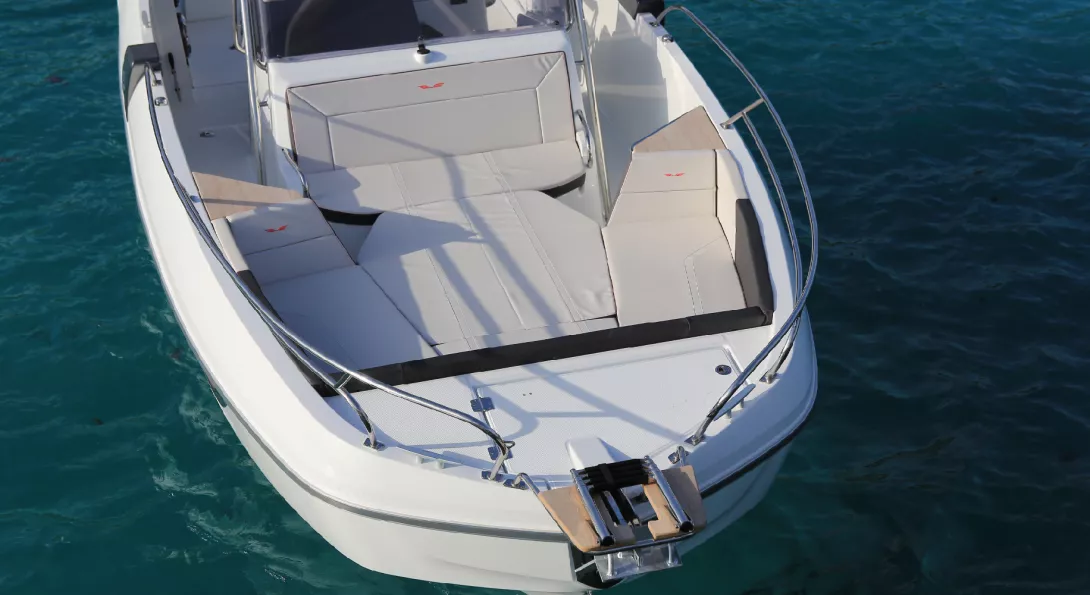 Innovative because of its many practical features, the forward lounge has two L-shaped seats with built-in storage, a saloon and a sun lounger. To aft, you have a choice between a four seat bench that converts into a sun lounger or fishing station.