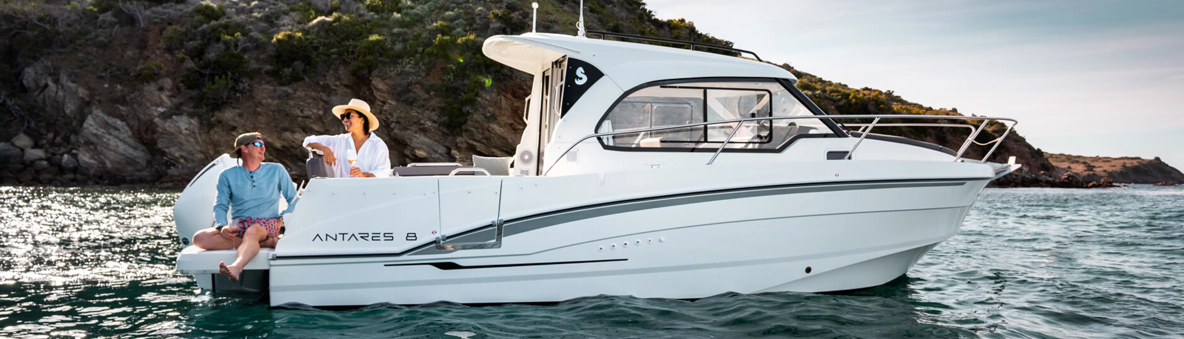 The ANTARES 8 retains the tulip-shaped hull design that is the flagship feature of the ANTARES iconic range, giving it excellent stability on the water and the ability to withstand and handle itself well in all conditions. The modular cockpit in the stern guarantees the crew optimal comfort. Another outstanding feature is the ergonomically designed helm station which has room for an optional 12-inch Garmin multifunction display. With its powerful 250-horsepower engine, the ANTARES 8 can reach a top speed of 35 knots, making it the perfect boat for day outings, fishing trips, and cruising with the family.