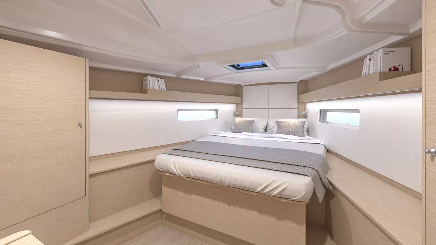Lorenzo Argento’s watchword in designing this yacht was to create a warm modern atmosphere with as much natural light and ventilation as possible. The Oceanis Yacht 54’s interior layout offers a chart desk and large saloon table which easily accommodates six adults. The interior can be built in two different wood tones, light oak or the more traditional walnut. In terms of layout, two versions are available: three cabins and two heads, or three cabins and three heads with an extra-large forward master cabin, in which it is easy to walk around the double bed (1.6 m wide). The trim show great attention to detail, such as the top quality upholstery, wood linings, riddles and lighting, making this 17 m sailing yacht ideal for cruising. Lastly, the numerous storage areas have been optimized: tanks and service areas are easily accessible and their location has been studied to improve weight distribution, illustrating that every detail of Oceanis Yacht 54 has been meticulously thought out to ensure that the crew is one with the craft and the sea.