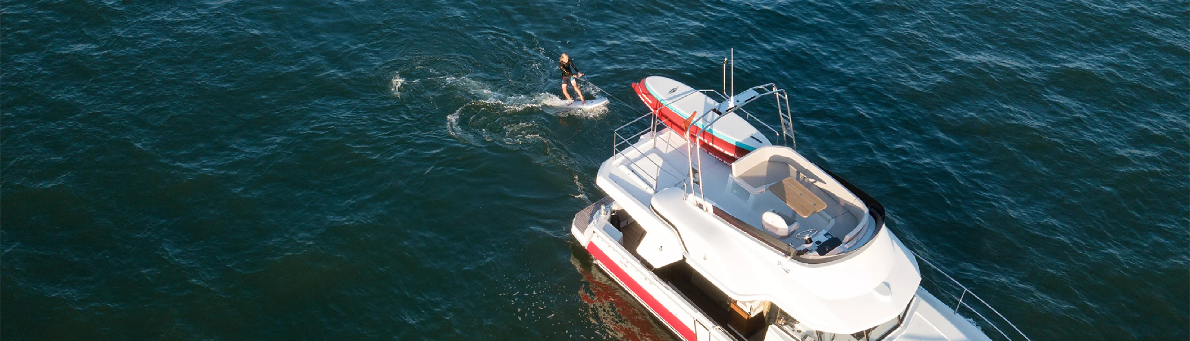 Gong Force One travels from reef to reef looking for the right wave, equipped with 15 or so boards, bags containing foils, and all the gear needed for tests and photo shoots. Often we are eight or ten people on board and, seen from the exterior, she looks more like a floating platform or an aircraft carrier than a cruising boat! There’s stuff everywhere: on the deck, on the flybridge, but it’s all really well organized and there still plenty of space to move about, pilot our drones, film and take photos. We position ourselves 300 metres from the coast, on the edge of a reef that looks good and, there, we open the two aft doors and the teak platform becomes our operational base and all this to music! In a few months, Gong Force One has become a real place to get away to off the coast of La Baule. Our customers come and enjoy a break with us on board. They love us and we love them! We also enjoy doing something amazing : when the sea is flat and you’ve worked hard all day, you set the engine to run at 10 knots to go wakeboarding and there you surf flat on one foil for ten minutes of sheer surfing pleasure. With a broad stern, the Swift Trawler creates a perfect wave. The sea is easy to access and climbing back on board is a doddle. This boat is really cool. Yes, I think that’s the right word, cool!