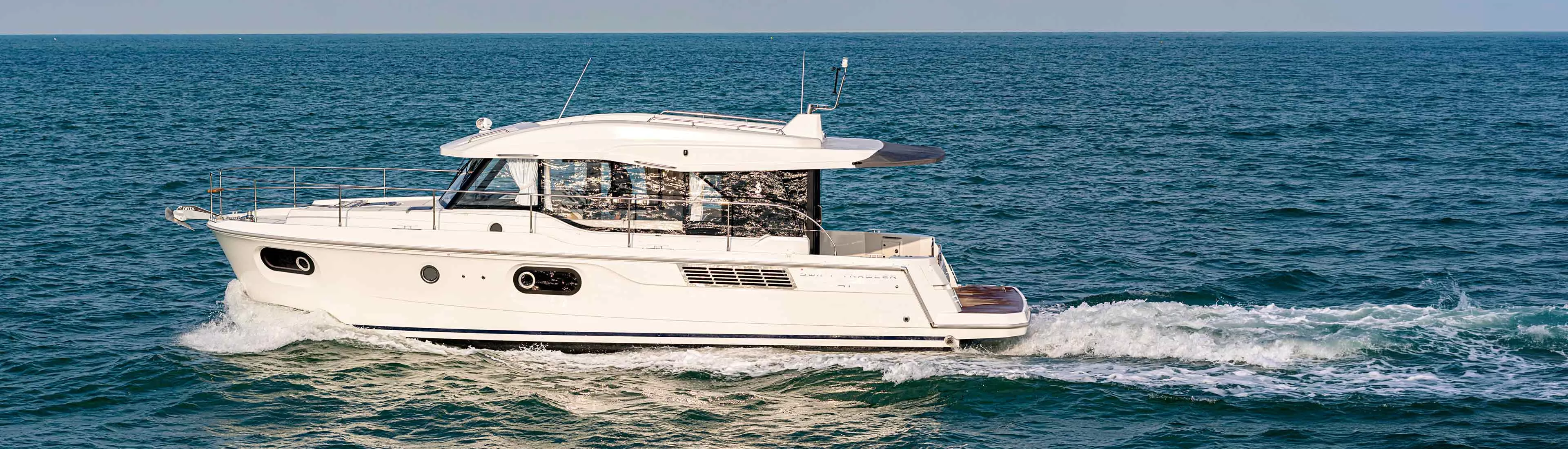 A generous passagemaker, the Swift Trawler 41 successfully renews the spirit and style of the Trawler range. Comfortable, practical, and boasting ample living space, this new, innovative 40-foot powerboat, available and both Fly and Sedan versions, has an on-board capacity of up to 7 passengers.