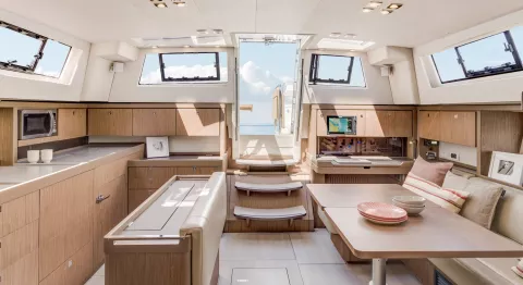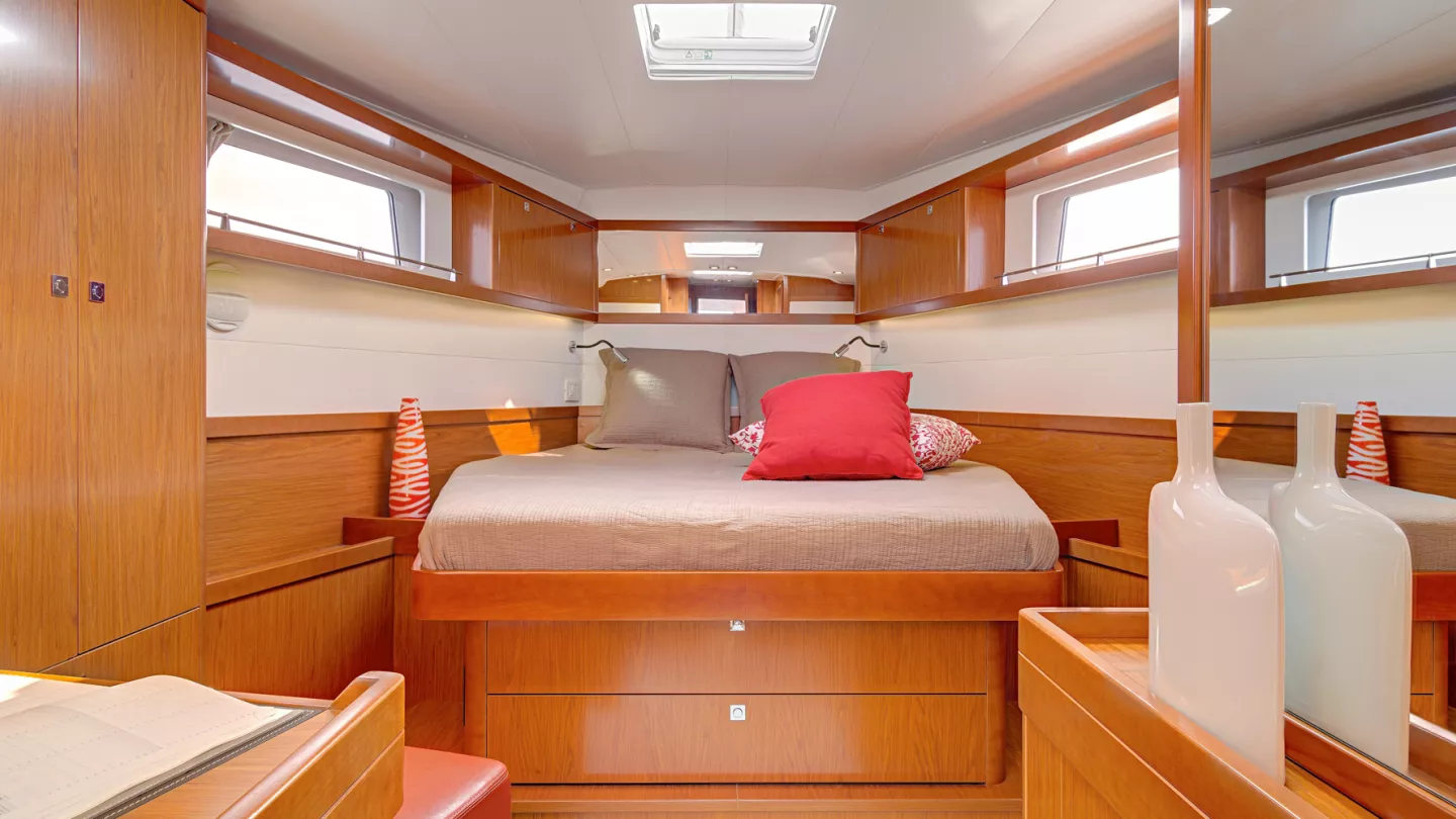 Accesible por tres peldaños desde la bañera, el gran salón bañado de luz ofrece una visión sobre el mar omnipresente. El espacio está subrayado por la cocina acondicionada a lo largo. En la proa del barco, tres espaciosos camarotes uno de los cuales el camarote armador, invitan a momentos de binestar total. El cuidado particular aportado a los detalles y acabados así como la elección de los teñidos de las maderas ‘Alpi fruitier’ o ‘Nogal mate’ crean una atmósfera a la vez lujosa y cálida.