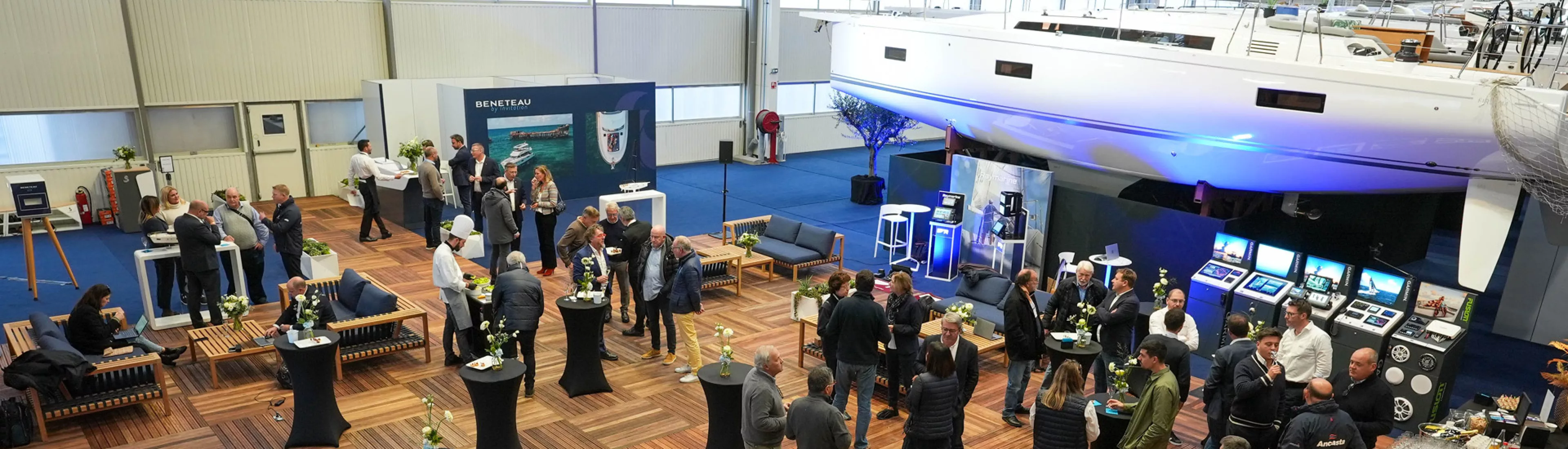 Transformando un edificio acondicionado para las expediciones en un verdadero salón náutico, BENETEAU expuso 10 modelos poniendo a disposición de los visitantes su equipo de expertos (diseñadores, equipos comerciales, producción, productos, colaboradores y proveedores…) a fin de responder a las preguntas sobre la construcción de un barco, desde su concepción hasta su entrega.