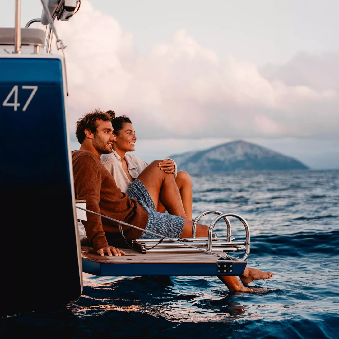 El Pack Elegance mejora el ambiente con una mesa de madera maciza de Alpi, una cama tapizada en el camarote principal, espejos ahumados y persianas plisadas, para una atmósfera cálida y refinada.