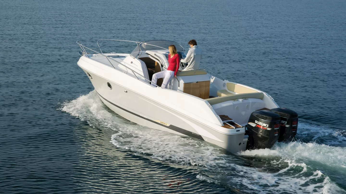 In addition to its imposing dimensions, its fairly high deck line or its very comfortable cockpit, the 850 offers a liveability that is worthy of a cabin cruiser, as well as style, and draws a part of its velocity from the Air Step system.  For day trips or trips of several days, this model will delight the whole family.