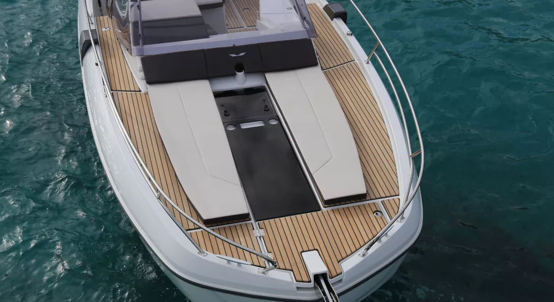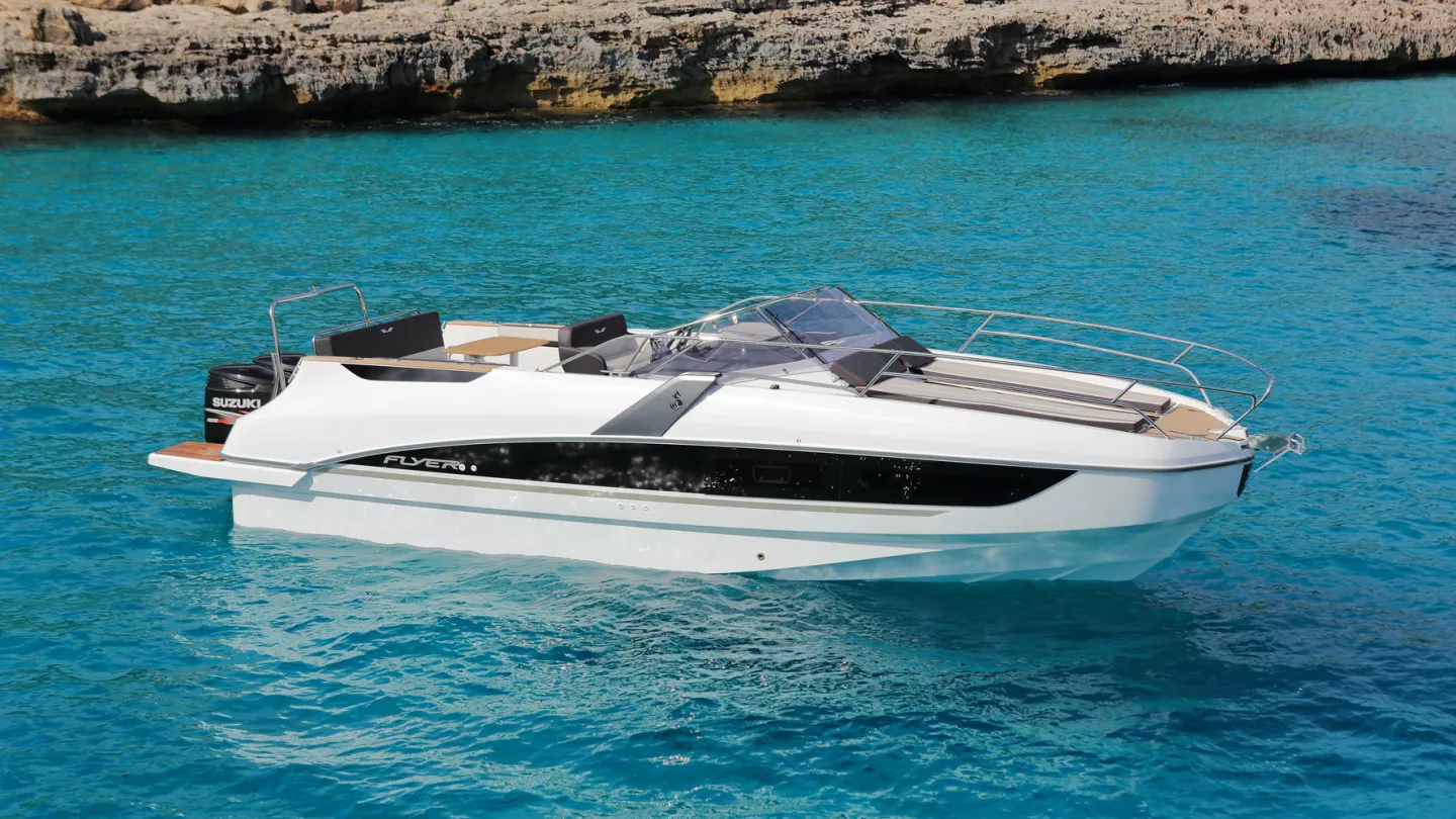 The flyer 8.8 SUNdeck is a distillation of technology combining exceptional performance at sea and an uncommon level of comfort.Built on second generation Air Step® hull, she will take up to 500 HP engine power and can carry up to 11 people.Driving is a real pleasure on this type of craft, since the Flyer 8.8 sundeck combines sensations, relaxation and safety to perfection.