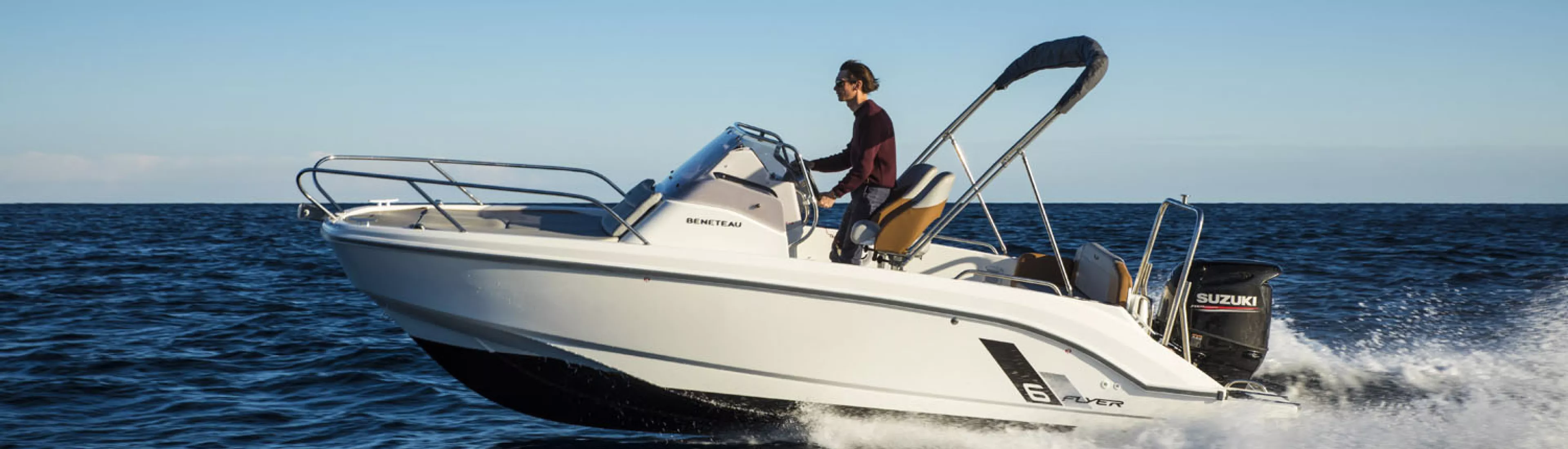 The Flyer 6 SUNdeck is the perfect little powerboat for quick get-away trips to sea! Easily towable with intelligently designed spaces, up to 6 people can enjoy a ride in this outboard-powered boat.