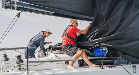 Avec les conditions rencontrées, le petit temps lui convenait bien. Elle est performante au reaching : nous avons eu un court bord de reaching où nous avons immédiatement atteint la vitesse, alors qu’au VMG, il faut vraiment se battre. La sensation à bord est très agréable, mais il reste évidemment beaucoup à améliorer ; nous n’avons fait qu’effleurer son potentiel. La performance dépend beaucoup de la configuration des voiles et des transitions effectuées pendant la course. Malheureusement, nous avons manqué une transition, et les deux premiers bateaux ont pris quelques milles d’avance. Après cela, avec des équipages solides devant et un vent assez stable jusqu’à l’arrivée, il était presque impossible de revenir.