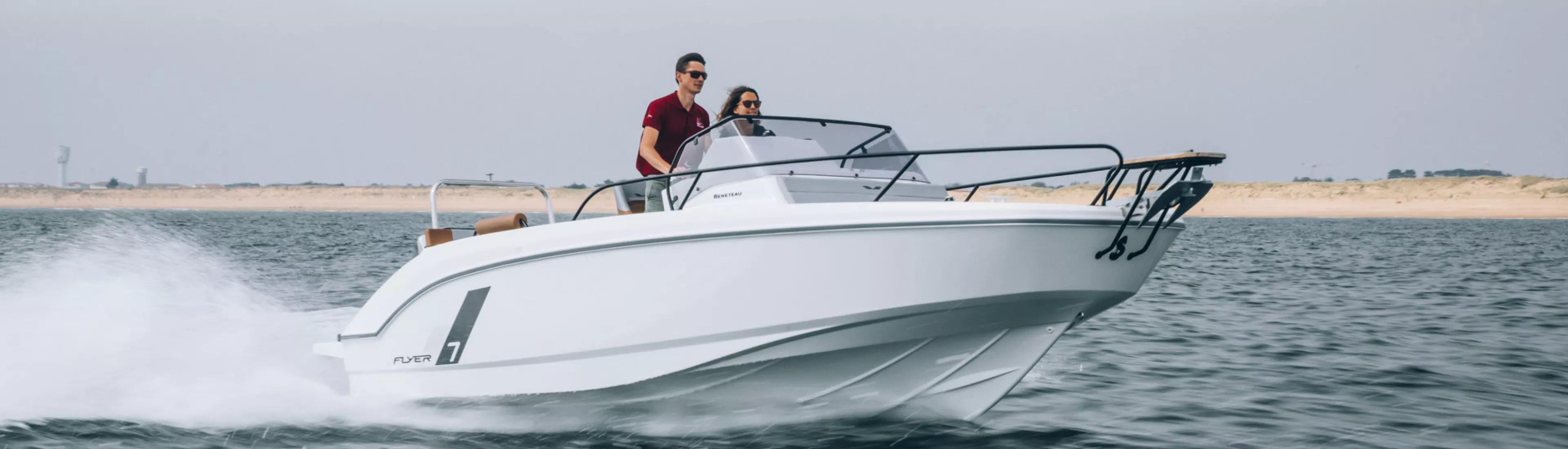 Chiamato a sostituire il 6.6 della stessa gamma, questo nuovo modello del cantiere francese ha il suo punto di forza nel pozzetto, vivibile e molto versatile. Versatile è un aggettivo un po’ abusato quando si parla di barche, ma è quello che meglio descrive l’elemento di novità che Beneteau ha introdotto nella gamma Flyer con il modello 7 Sundeck. Aggettivo che si applica in pieno al pozzetto, punto di forza di questo natante e per nulla alla prua, che a differenza di quanto accade nella versione Spacedeck, è configurata unicamente con un grande prendisole. L’accesso a bordo è consentito attraverso la pedana di sinistra, che incassa anche la scaletta per il bagno, oltre la quale si raggiunge il pozzetto.