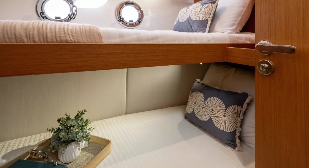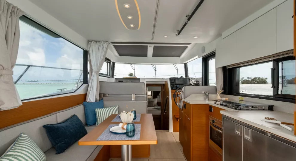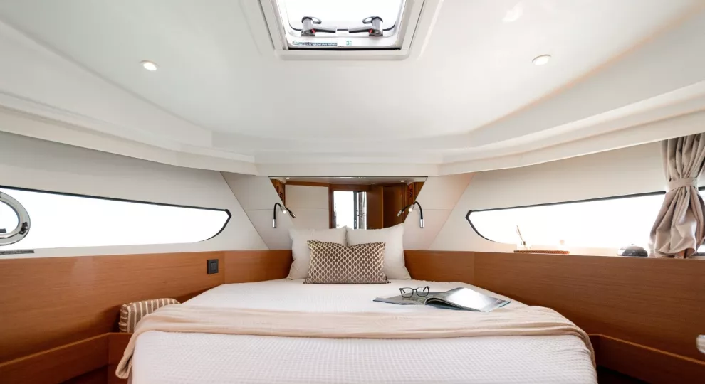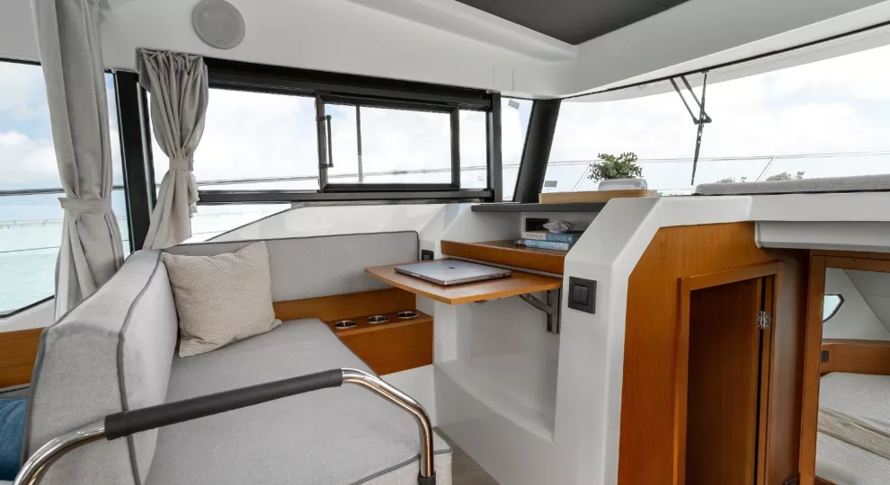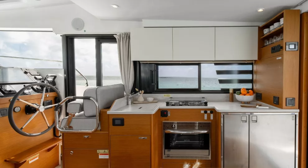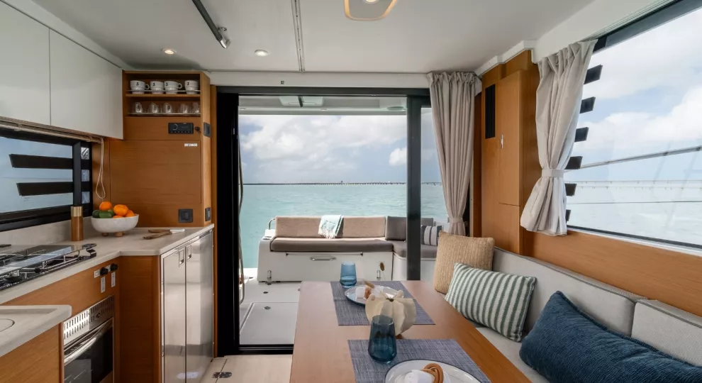 Social mixing is at the heart of the design elements on the deck level, with complimentary u-shaped galley and sofa creating the sense of space. This is supported by significant storage options and a large fridge & freezer option. The sofa quickly converts into a double bunk with privacy curtain.