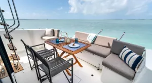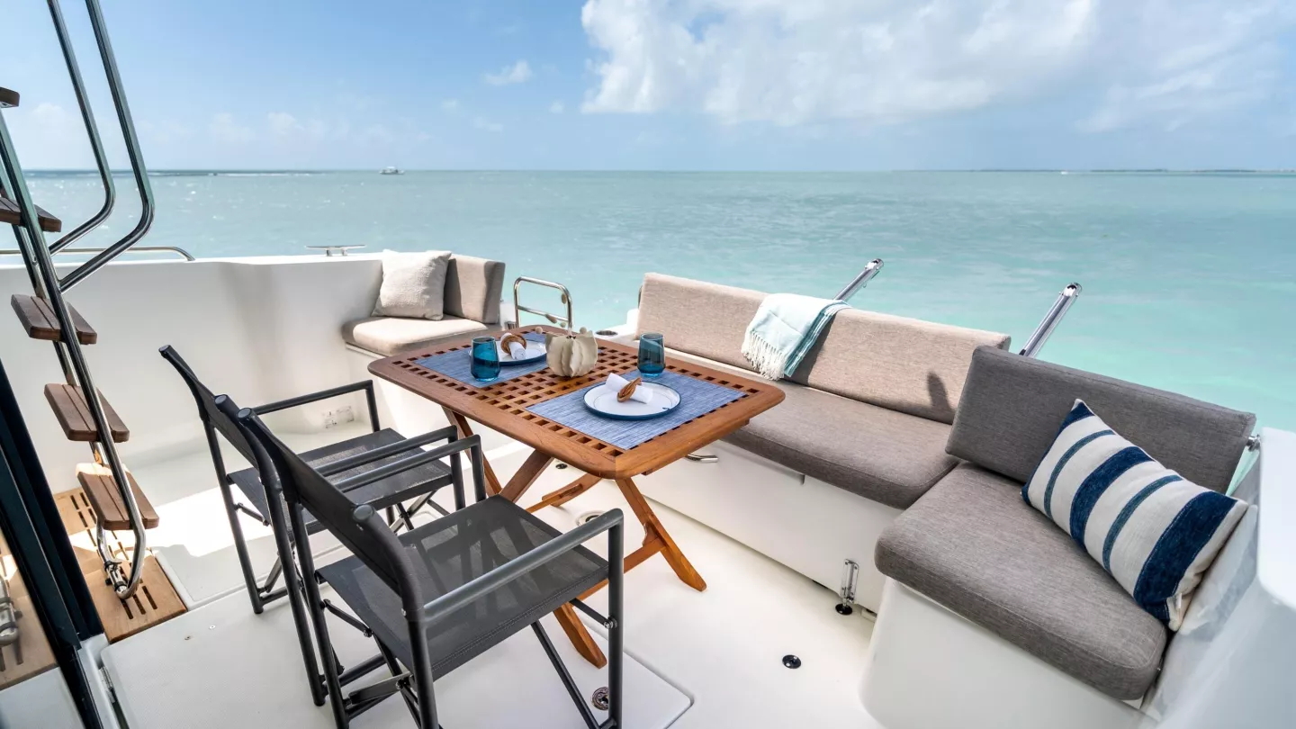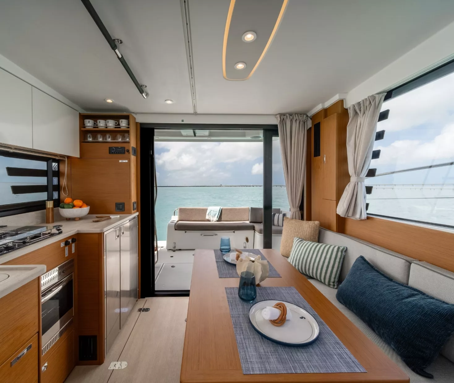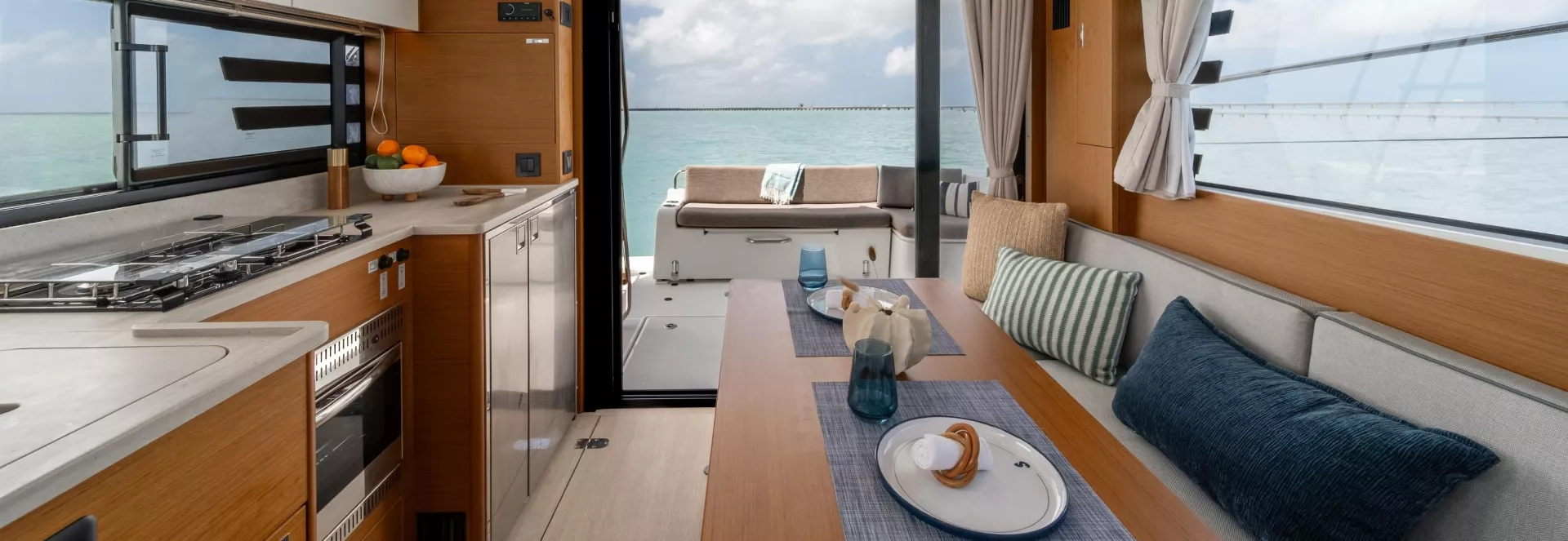 Social mixing is at the heart of the design elements on the deck level, with complimentary u-shaped galley and sofa creating the sense of space. This is supported by significant storage options and a large fridge & freezer option. The sofa quickly converts into a double bunk with privacy curtain.