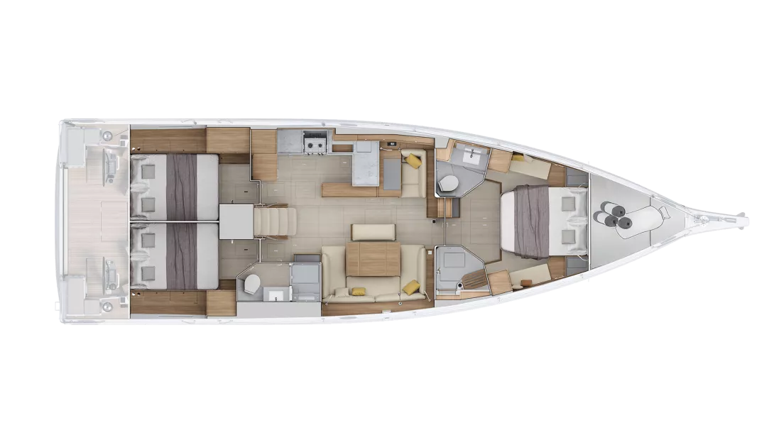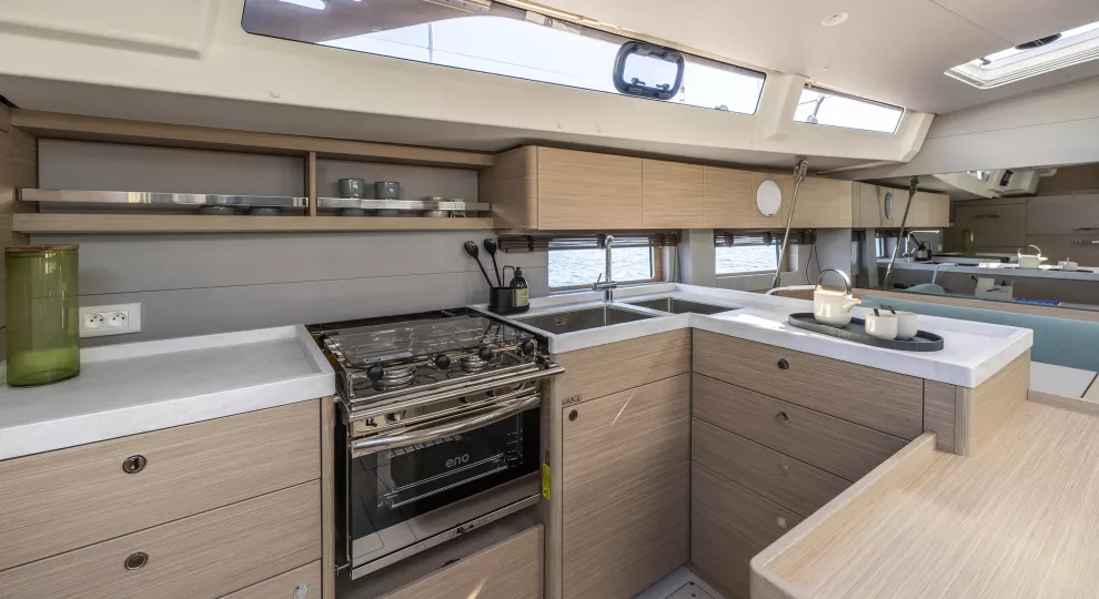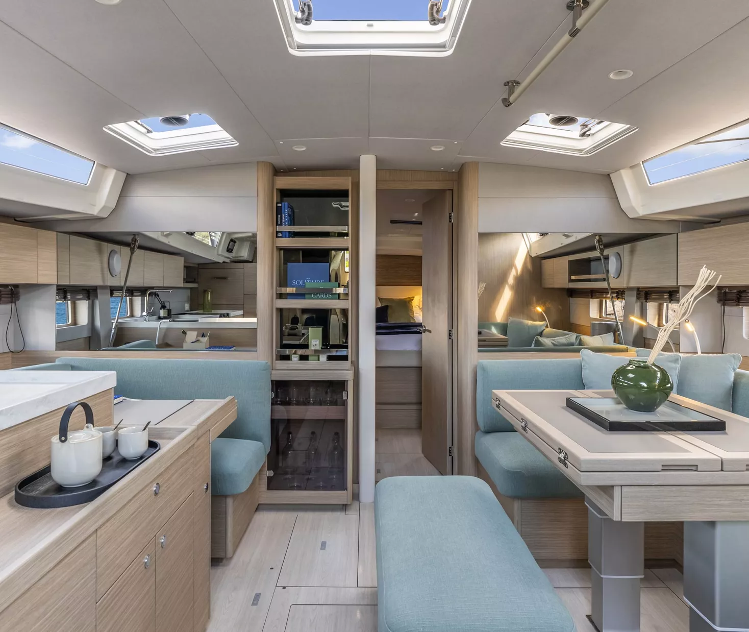 船舱内部,每个细节都力求营造时尚而轻松的氛围。缓坡的舱梯是遨享仕系列巡航帆船的标志性设计,通向明亮的生活空间,C型厨房与之无缝衔接。这艘帆船配备全高冰箱,并可选配第二台冰箱,为家庭出游提供绝佳的海上自主性。可丽耐台面和带收纳空间的服务舱口,让您在船上准备餐食成为一种愉悦的体验。