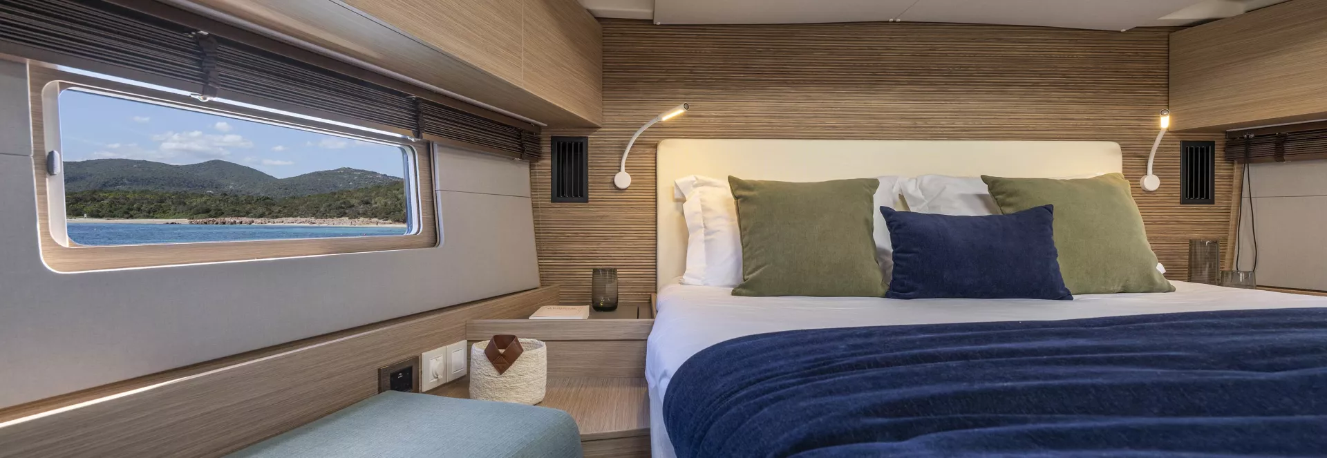 您一定会爱上主人套房,它是这个令人惊艳的室内空间的焦点,拥有宽裕的空间和奢华的氛围。套房设计以非凡的舒适性为目标,配有软垫床头板、一张160cm的大床以及充足的收纳空间:两个吊柜、大型的舱口围板隔间和一个床下大抽屉。自然光透过巨大的舷窗倾泻而下,您可欣赏到壮丽的海景,而防眩光聚光灯和暖白色LED灯则在夜晚营造出温馨的氛围。